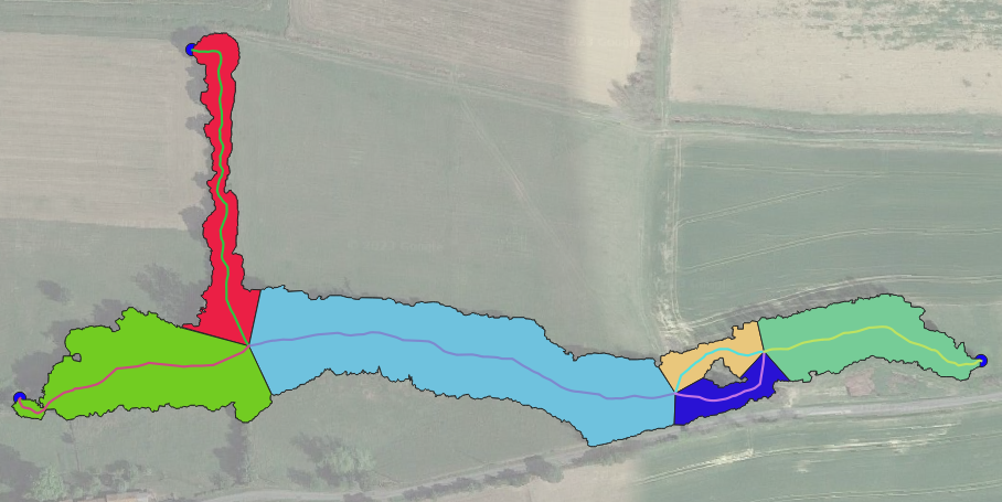 Polygons are split at every non-extremity node (i.e., nodes with a degree greater than 1). The primary key (PK) and foreign key (FK) fields in the related layers are automatically updated to reflect the new topology.